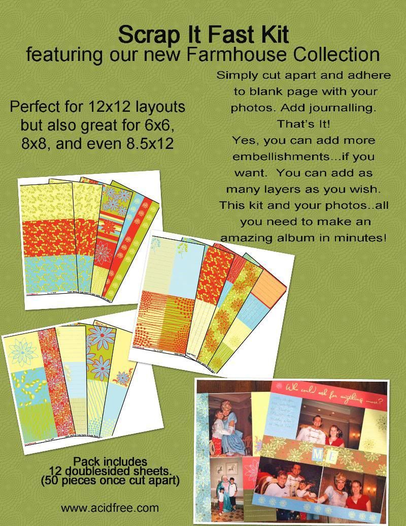 These kits, featuring their new Farmhouse paper collection", includes 12 double-sided printed sheets of paper. These can be cut apart in various ways to make 12X12, 6X6, 8X8, and more layouts!