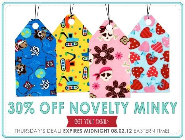 Today's daily deal from Fabric.com is 30% off novelty-patterned Minky fabrics!
